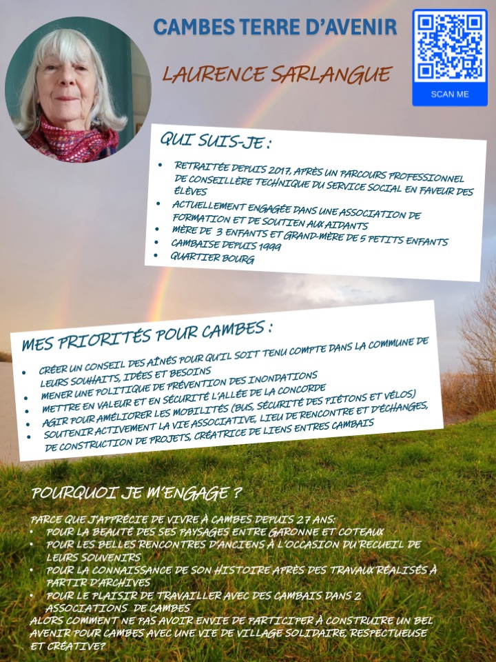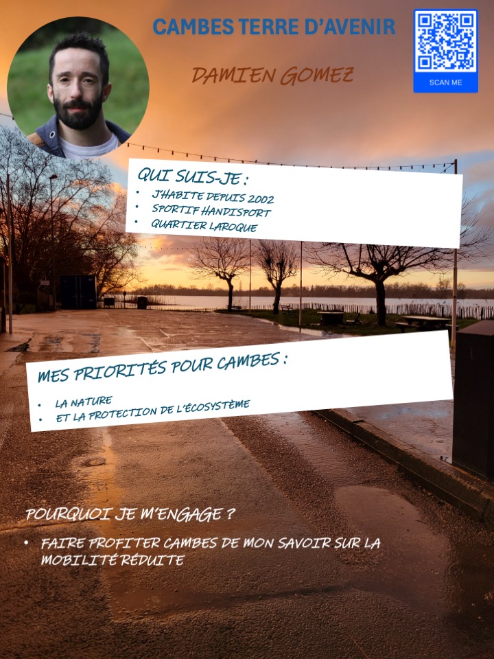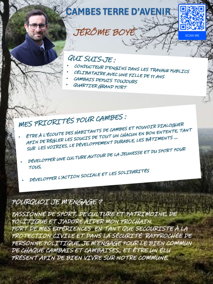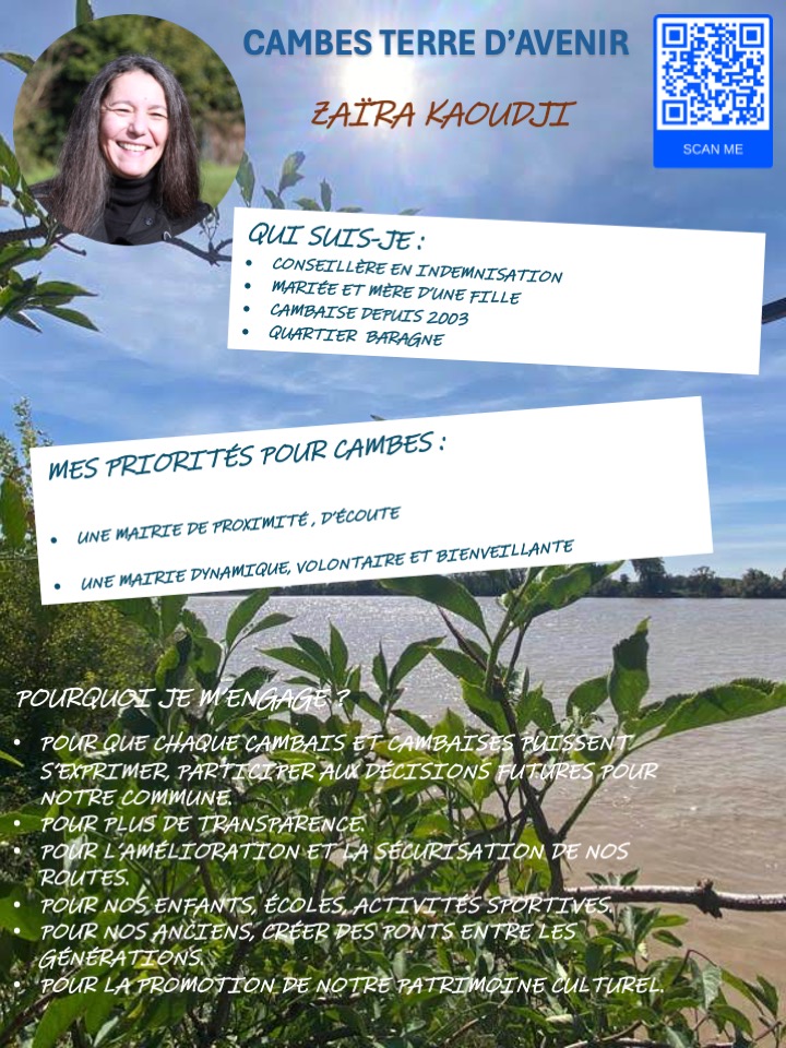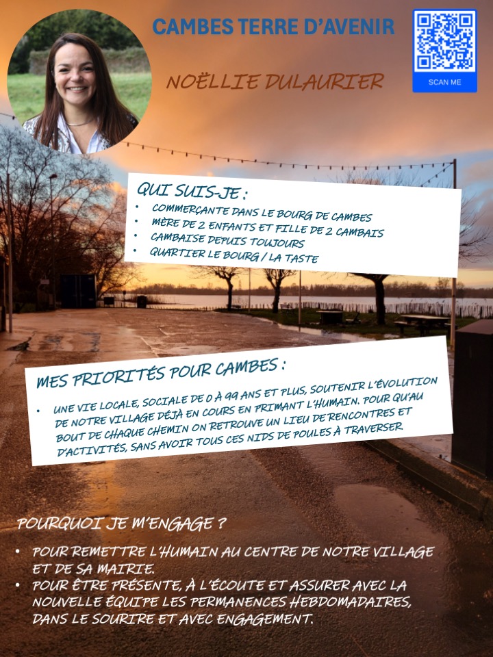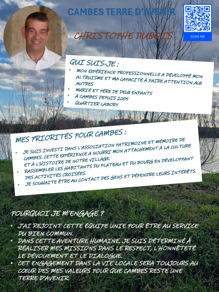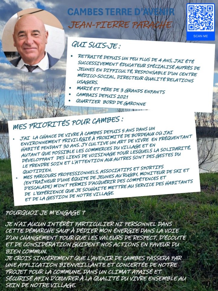 C’est pour tout cela que je m’engage avec humilité et ambition pour Cambes et tous ses habitants dans un esprit d’ouverture et de tolérance sans porter d’opinions radicales et abruptes.
