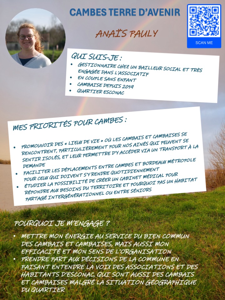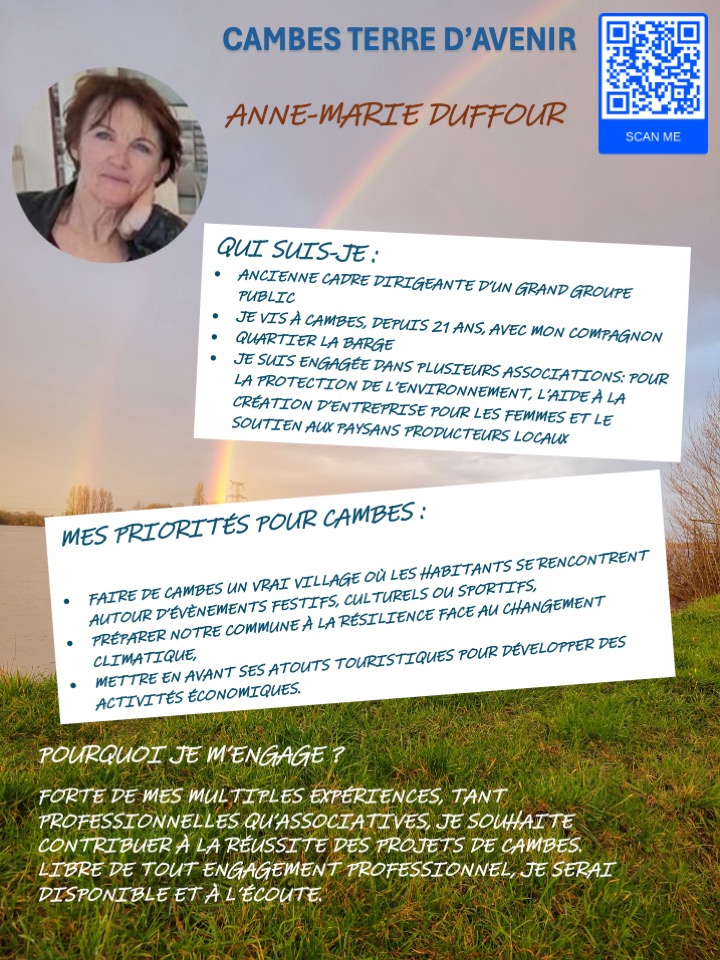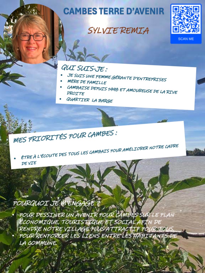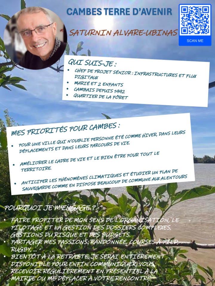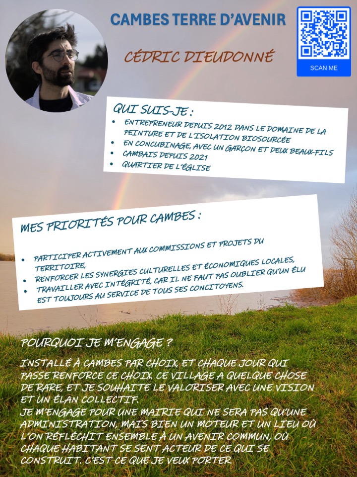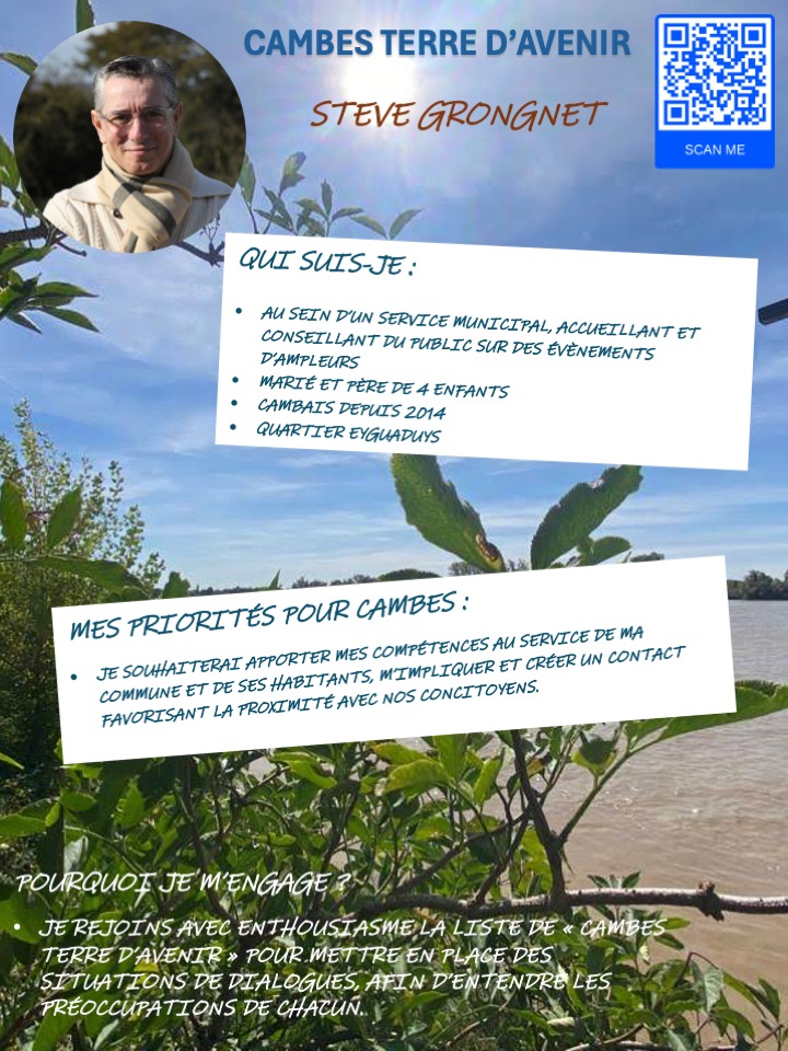 C’est pour tout cela que je m’engage avec humilité et ambition pour Cambes et tous ses habitants dans un esprit d’ouverture et de tolérance sans porter d’opinions radicales et abruptes.