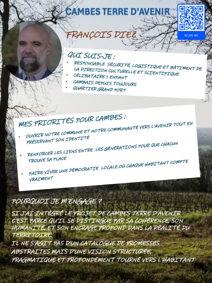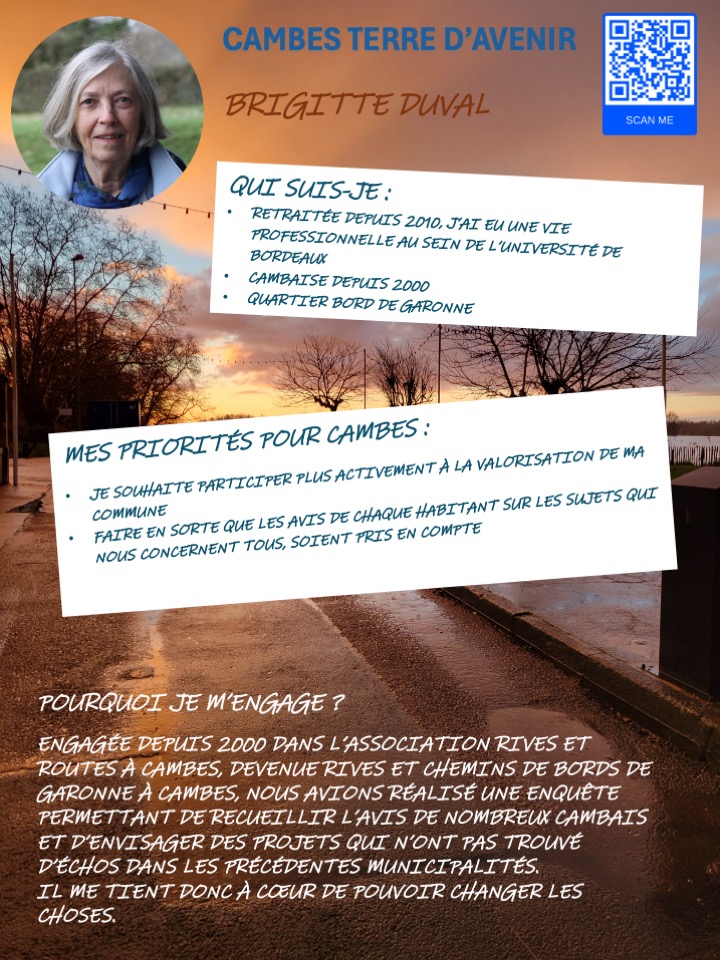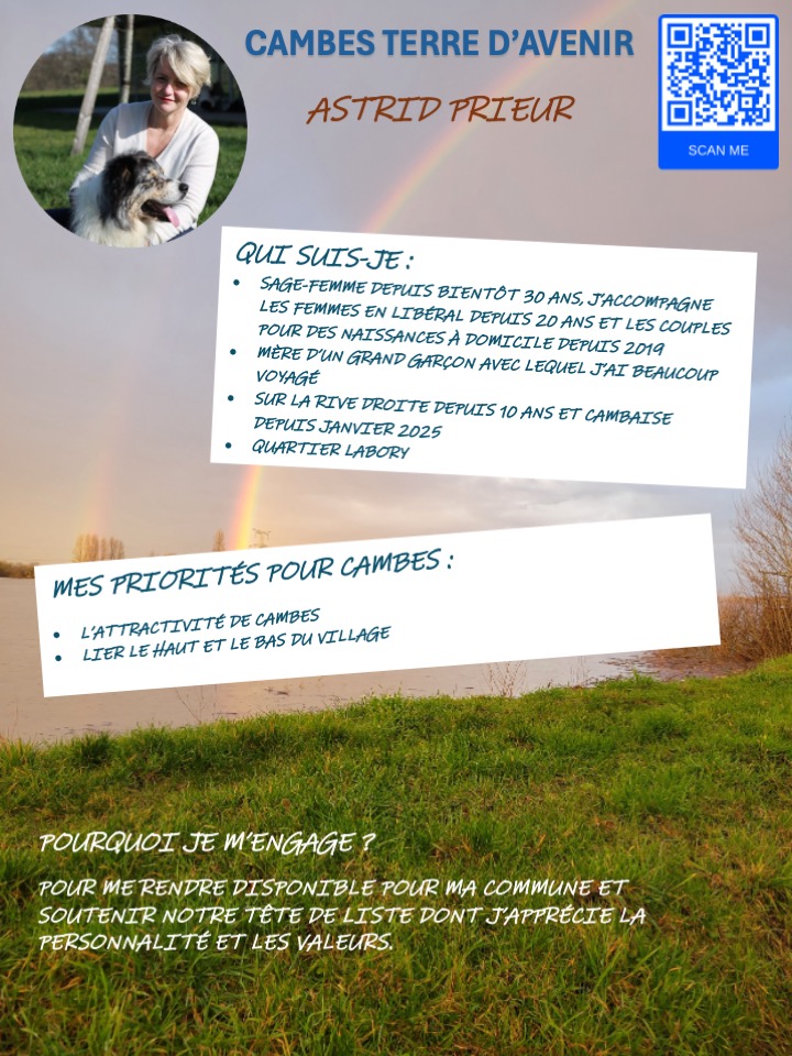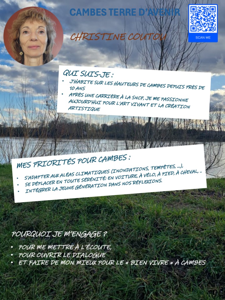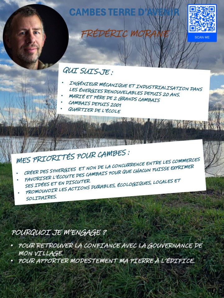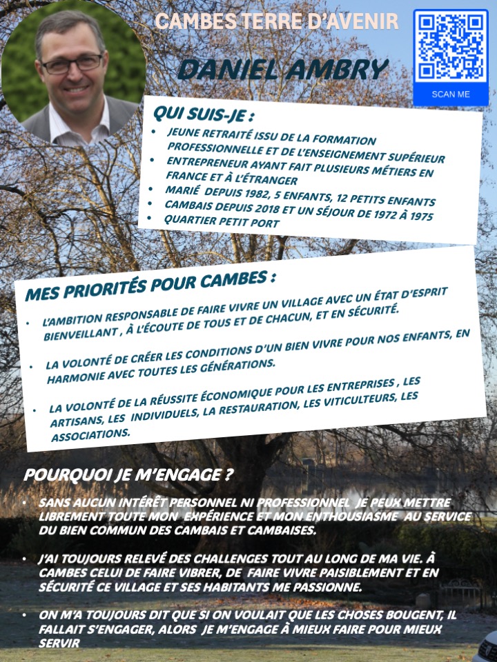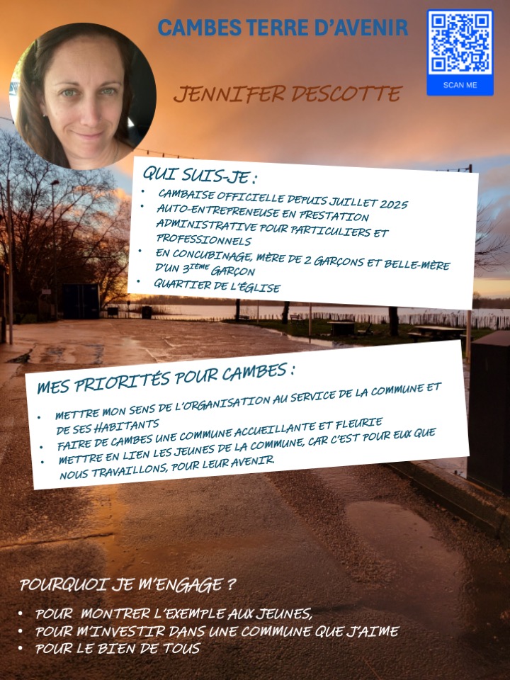 C’est pour tout cela que je m’engage avec humilité et ambition pour Cambes et tous ses habitants dans un esprit d’ouverture et de tolérance sans porter d’opinions radicales et abruptes.
